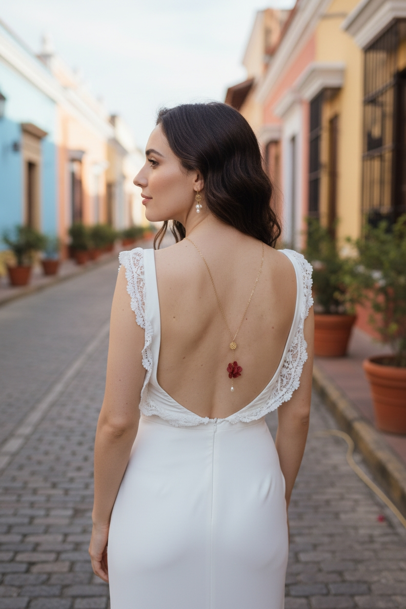 À l’arrière, une seconde perle prolonge la ligne du bijou et mène à une magnifique fleur d’hortensia stabilisée, positionnée au creux du dos pour un rendu poétique, aérien et très raffiné.