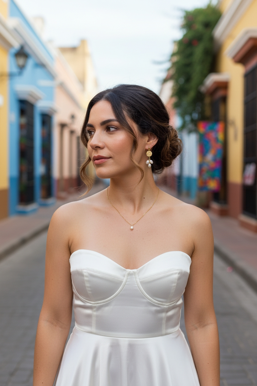 Le bracelet assorti adopte une ligne fine et élégante, idéale pour accompagner une robe de mariée sans surcharger la silhouette. Il est orné en son centre d’une perle de culture délicate, subtilement mise en valeur par une monture épurée. Léger et confortable à porter, ce bracelet apporte une touche de lumière au poignet et complète harmonieusement le collier de dos. Il convient aussi bien à une mariée qu’à une demoiselle d’honneur ou pour être reporté après la cérémonie.
