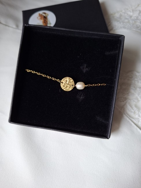 La perle est reliée à un petit sequin martelé, dont la texture capte délicatement la lumière et souligne le caractère fait main du bijou. L’ensemble est monté sur une chaîne fine réglable, permettant un ajustement parfait au poignet pour un confort optimal tout au long de la journée.