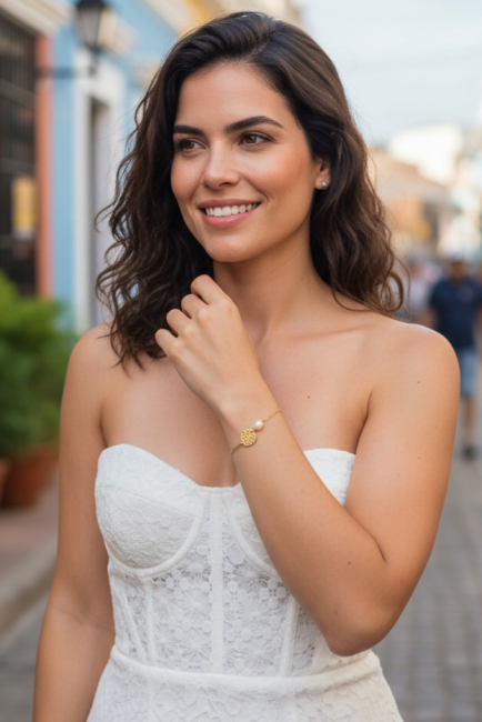 Le bracelet est orné d’une perle de culture naturelle couleur crème, aux nuances douces et légèrement satinées. Chaque perle présente de subtiles variations et un éclat naturel, signe de son authenticité et de sa qualité. Sa teinte crème apporte une lumière chaleureuse qui s’accorde parfaitement avec une robe de mariée blanche, ivoire ou nude.