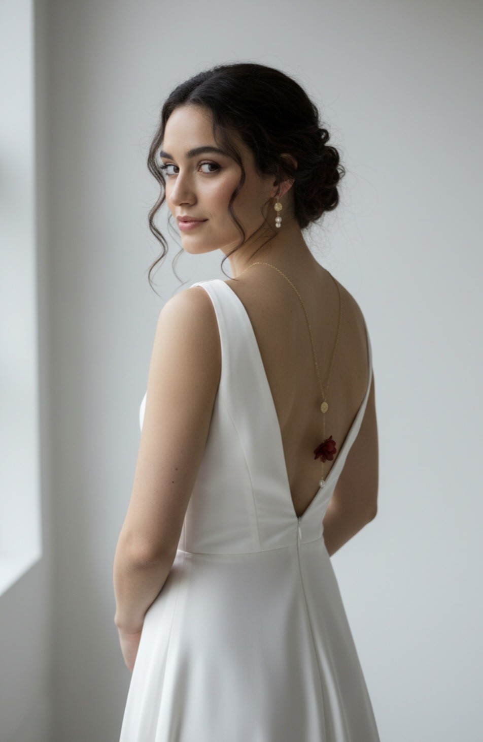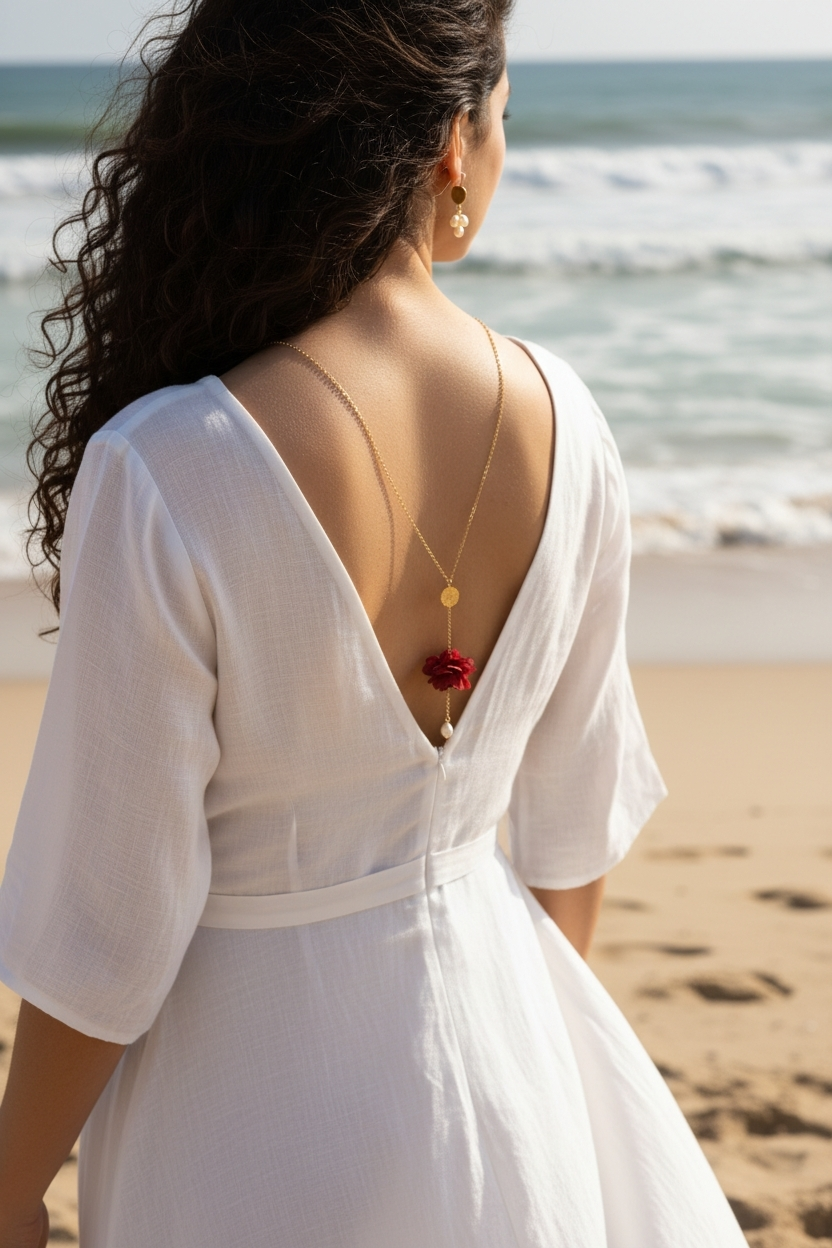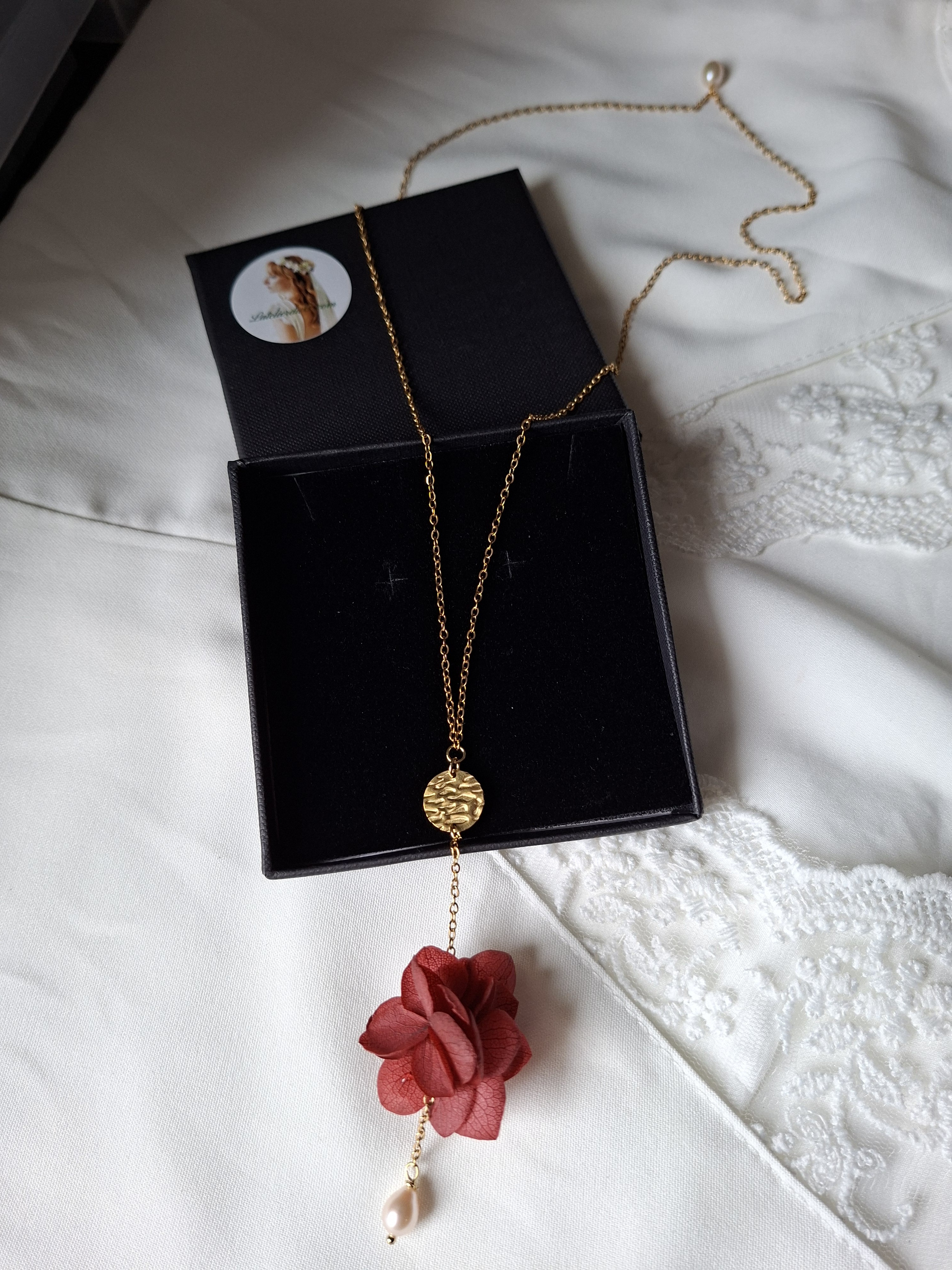 À l’avant, une perle de culture lumineuse vient souligner discrètement le décolleté, apportant une touche de lumière raffinée sans alourdir la silhouette. À l’arrière, le collier se prolonge avec finesse le long du dos pour révéler une seconde perle, puis une fleur d’hortensia stabilisée couleur bordeaux, délicatement positionnée au creux des reins. Cette mise en scène du bijou attire le regard et met en valeur la ligne du dos avec subtilité.