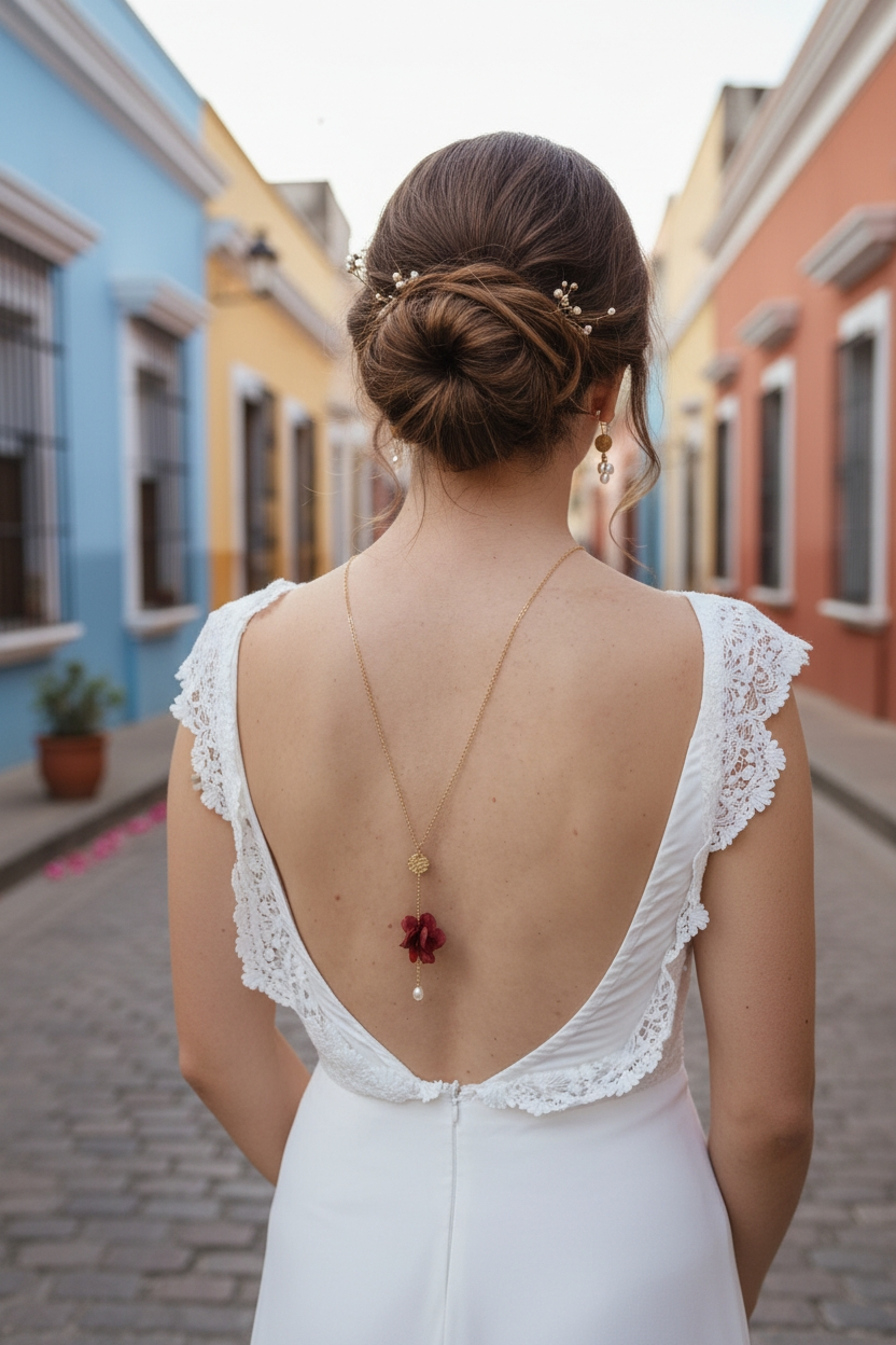 Ce collier de dos a été imaginé pour accompagner la mariée tout au long de sa journée, de la cérémonie jusqu’à la soirée, en apportant une touche florale précieuse et inoubliable.