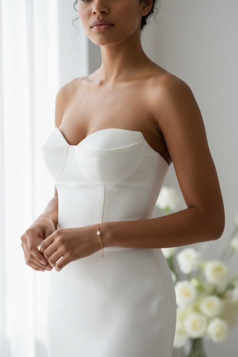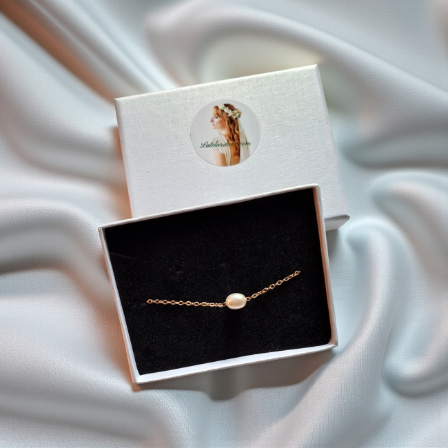 La perle, soigneusement sélectionnée pour sa douceur et son éclat nacré, est montée sur une chaîne ajustable, garantissant un confort optimal et une adaptation parfaite à toutes les morphologies. Ce bracelet se décline en version argentée ou dorée, afin de s’harmoniser avec la robe, les autres bijoux et l’univers du mariage.