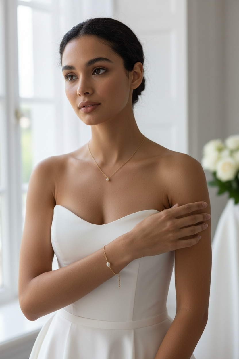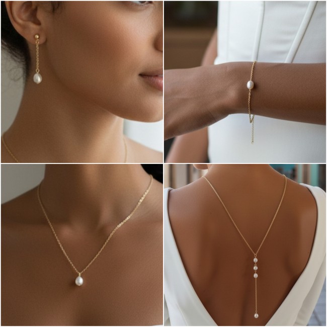 Cette parure de bijoux mariée a été conçue pour sublimer les robes de mariage au dos nu, les décolletés plongeants et les coupes épurées. Grâce à son système d’enfilage par la tête sans fermoir, il offre un confort optimal tout en garantissant une ligne fluide et élégante. Ce bijou de mariage met délicatement en valeur la nuque, le dos et la silhouette, tout en conservant une esthétique légère et raffinée.