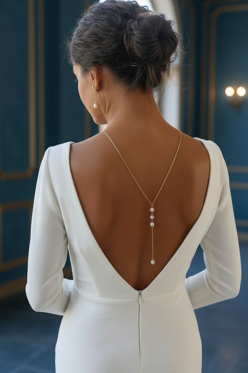 Pour une harmonie parfaite, ce collier de dos peut être associé à ses bijoux de mariage assortis, formant une véritable parure élégante et cohérente.