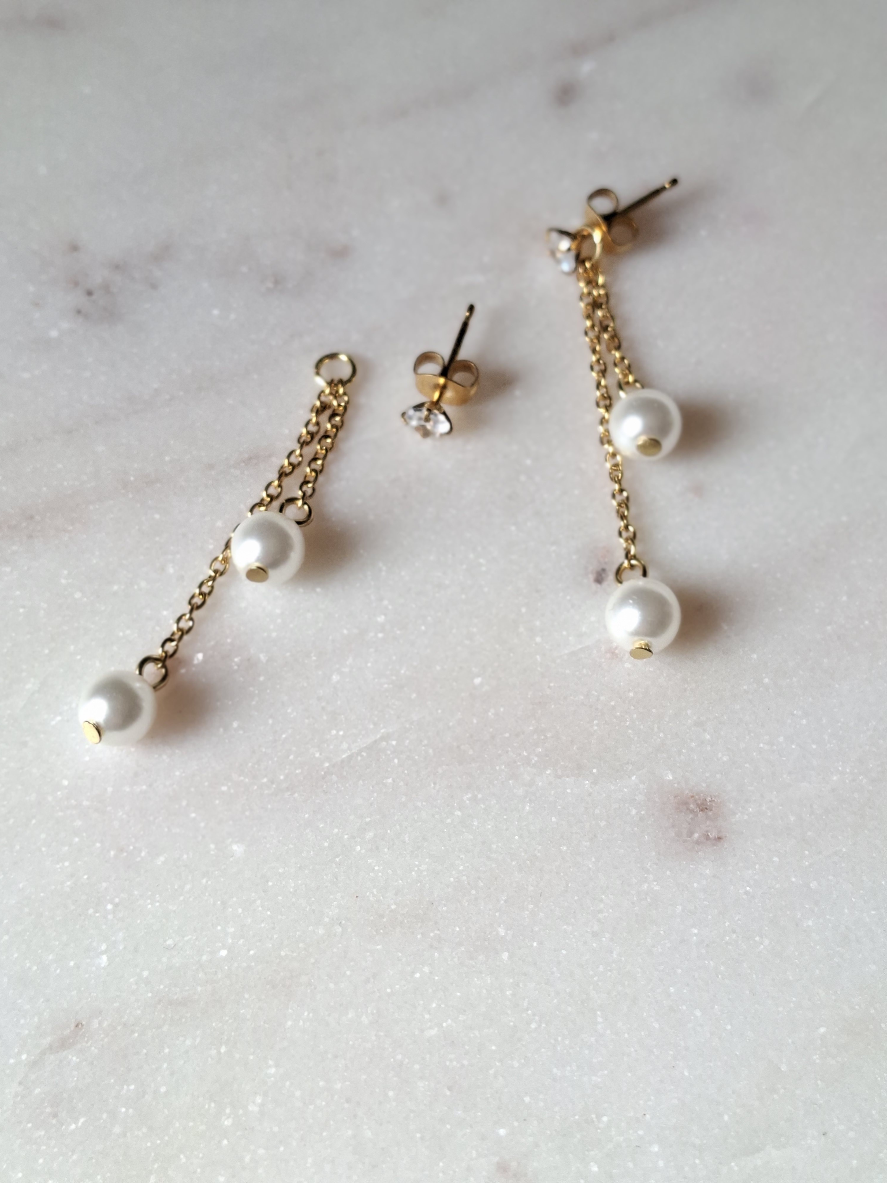 Des clous d’oreilles à strass amovibles avec chaînettes perlées pour un effet plus habillé