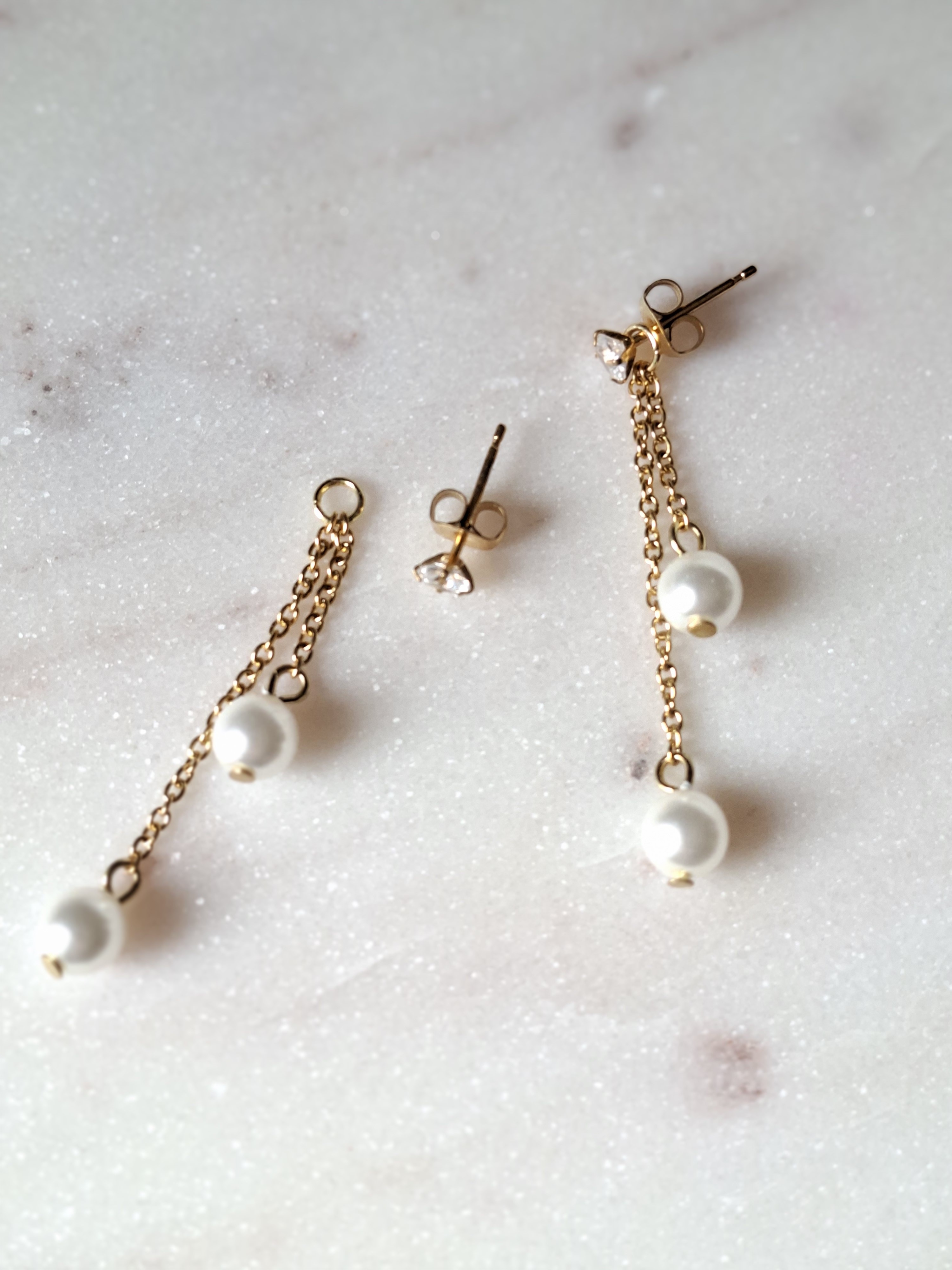 Chaque boucle associe deux perles blanches nacrées à des clous d’oreilles strass amovibles, permettant un porté modulable :