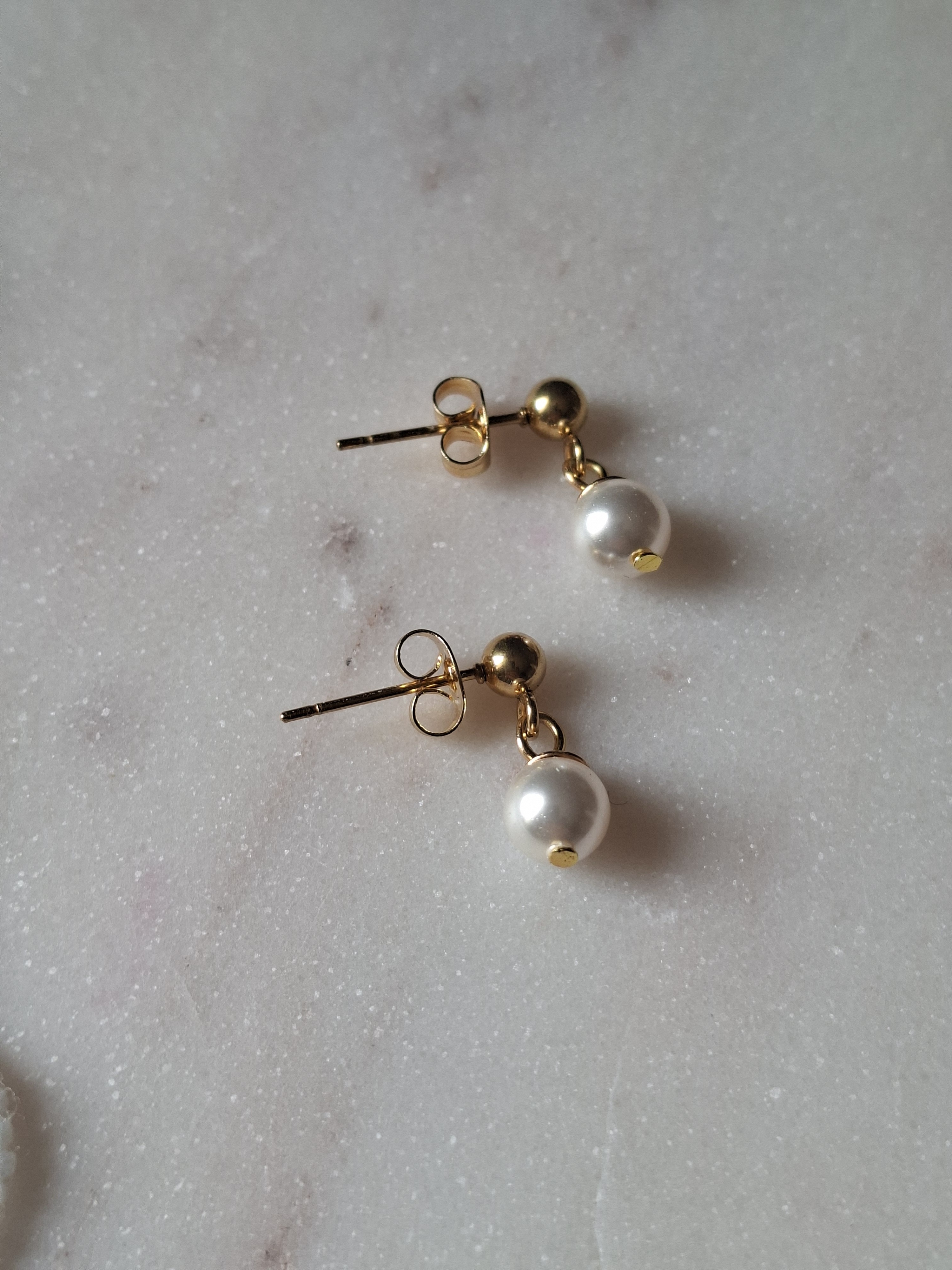 – Une paire de boucles d’oreilles en perles rondes de 6 mm, montées sur clous, pour un rendu à la fois discret, chic et lumineux. Disponibles en finition dorée ou argentée.