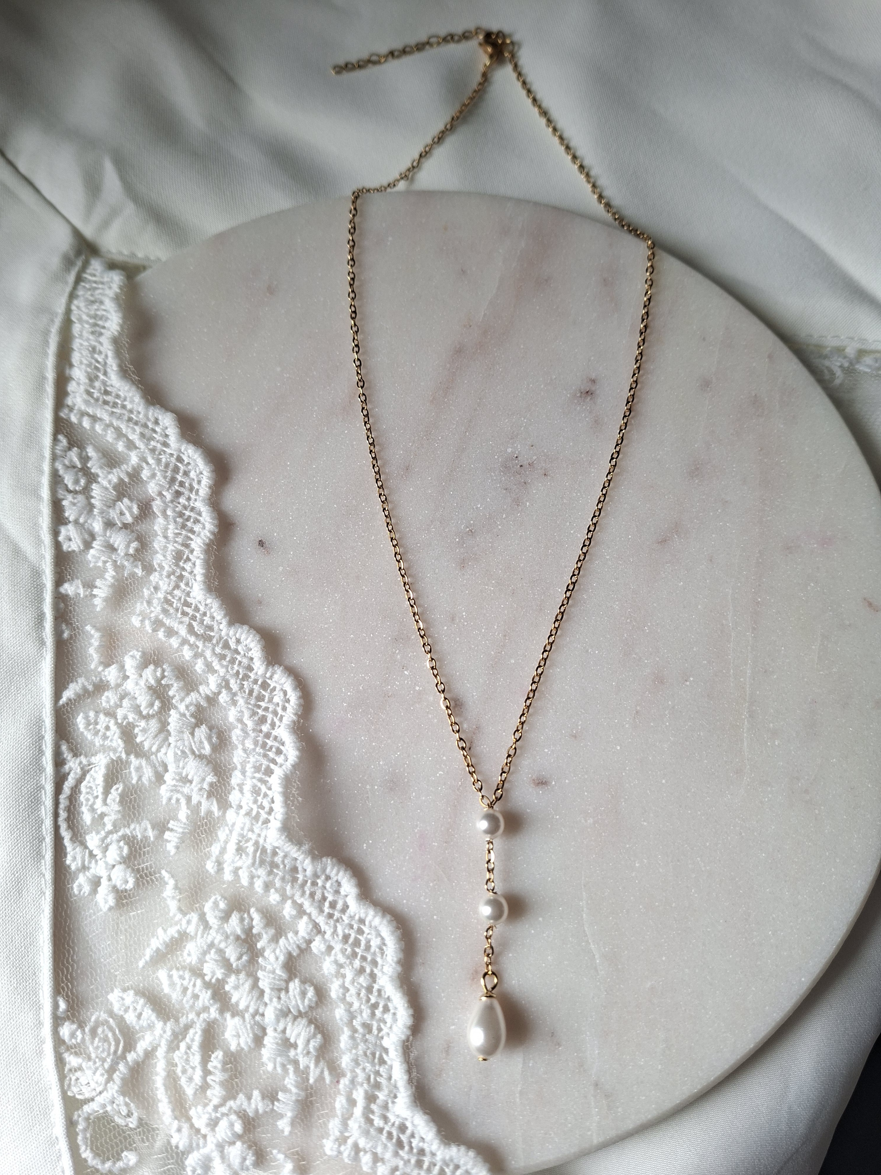 – Un collier délicat orné d’une goutte raffinée accompagnée de deux perles nacrées blanches, créant un jeu de lumière subtil au creux du décolleté.